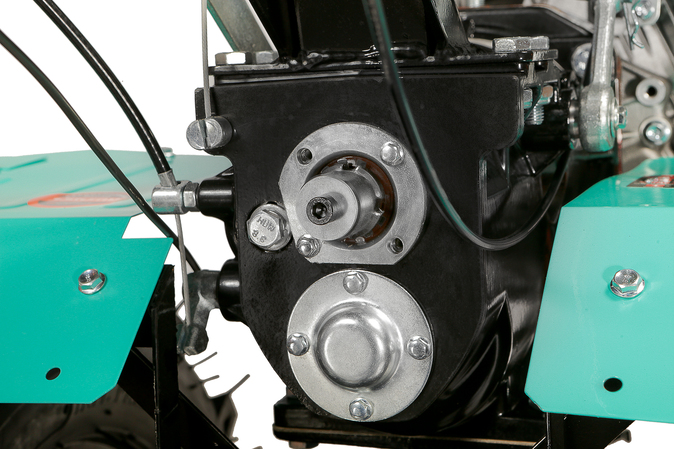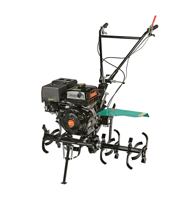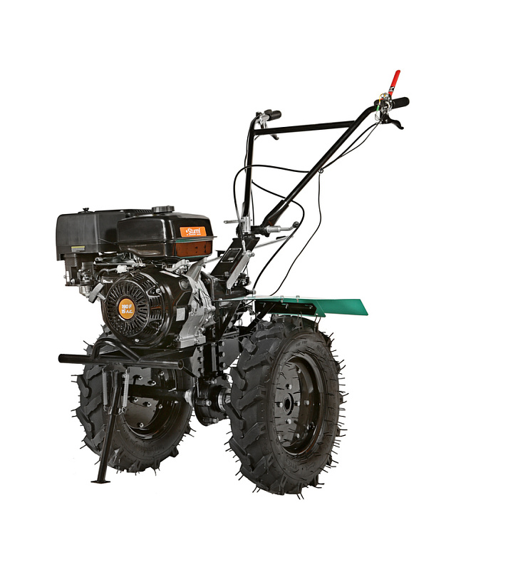 Мотоблок оснащен мощным 4-х тактный одноцилиндровым двигателем, мощностью 15 л.с. объемом 420 см3 и многоступенчатым редуктором, которые позволяют обрабатывать, за один проход, полосу земли шириной 1 м. При использовании пневматических колес, мотоблок с легкостью управляется с прицепом.
