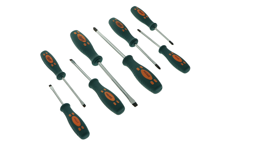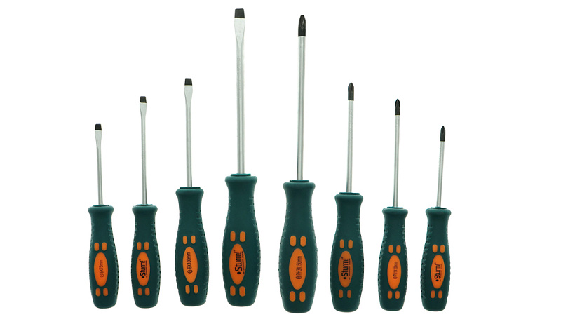 В комплекте 8 отверток: SL5x75; SL5x100; SL6x100; SL8x150;