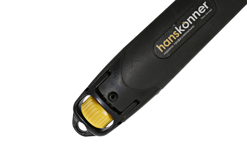 Строительный нож Hanskonner SolidFixation (усиленная фиксация лезвия) подходит для работ с высокими нагрузками, требующих повышенной точности и интенсивности. Благодаря корпусу из чистого высококачественного пластика и сверхпрочной металлической направляющей достигается улучшенная устойчивость конструкции при давлении на инструмент. Обрезиненная поверхность с упором под большой палец обеспечивает полный контроль ножа. Лезвие из высококачественной стали SK2 с трёхгранной заточкой и дополнительной обработкой лазером служит в 5 раз дольше стандартного. Уникальный запатентованный фиксирующий винт плотно прижимает режущий элемент к направляющей, что позволяет полностью передать усилие на рабочую кромку.