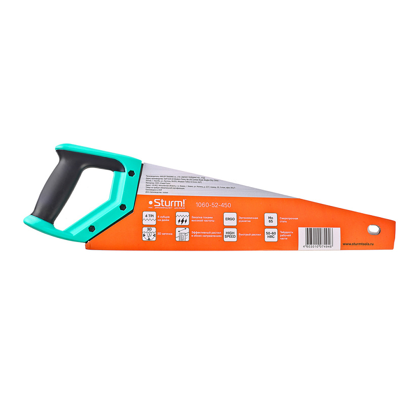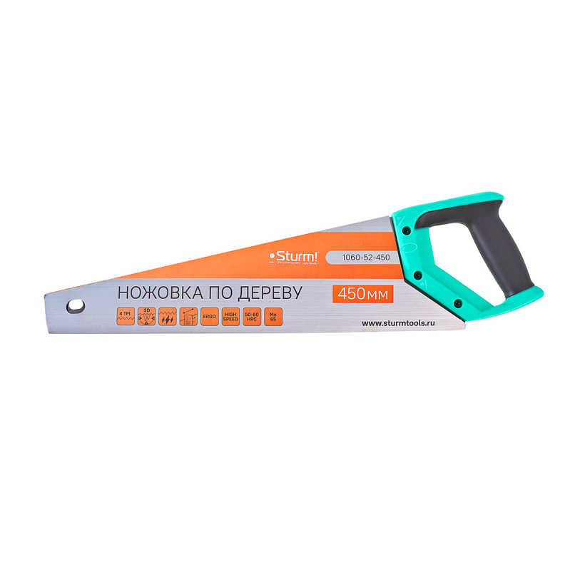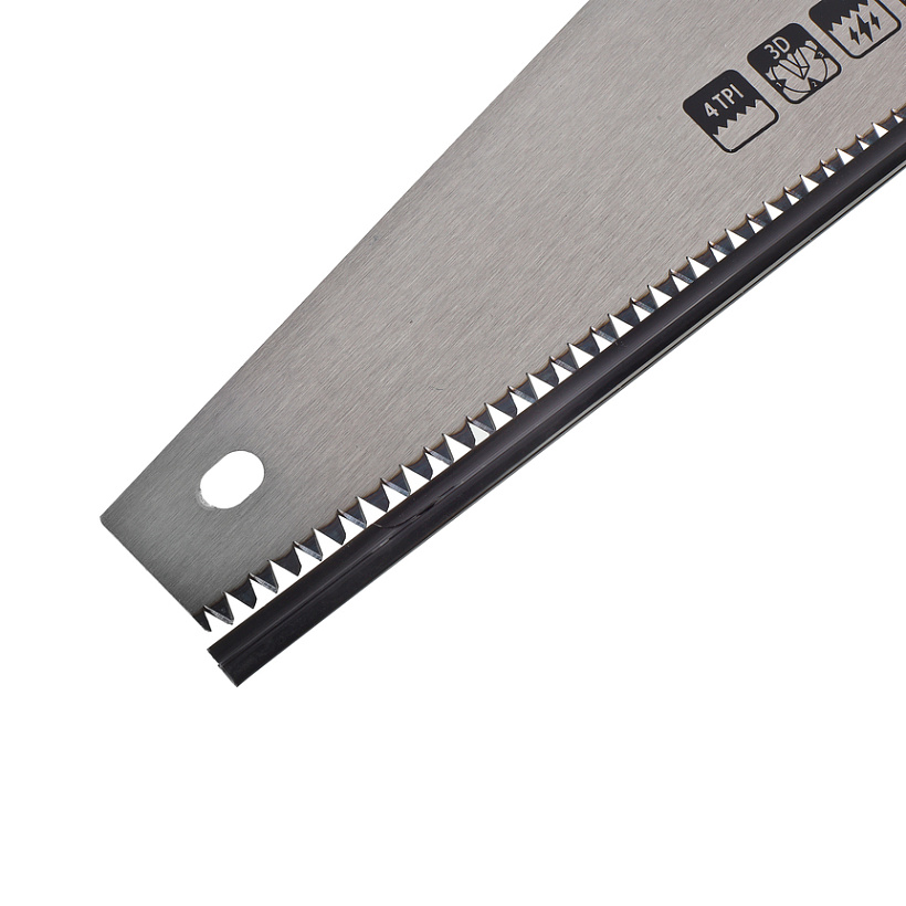 Антискользящая поверхность рукоятки; Каленый 3D зуб; Крупный зуб 4 TPI; Высокая скорость пиления; Ровный рез;