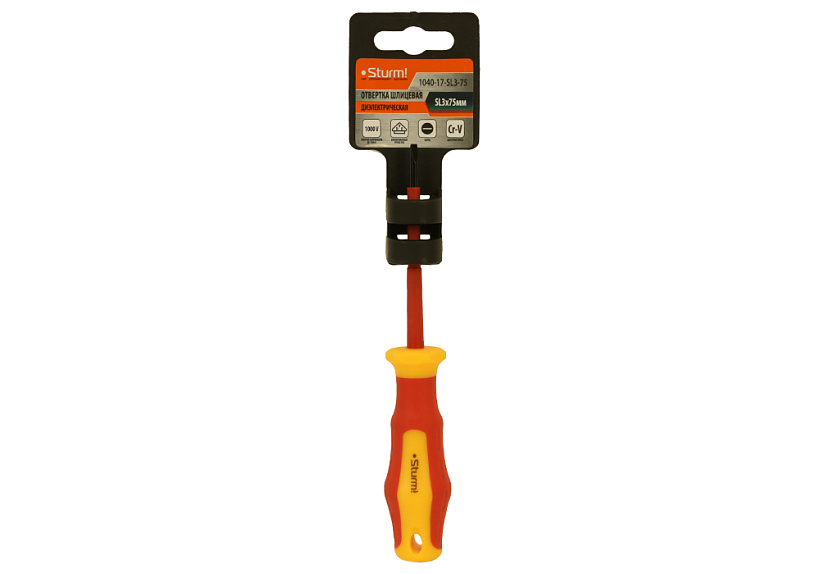 Отвертка Sturm! 1040-17-SL3-75 с многокомпонентной ручкой эргономичной ручкой. Отвертка для безопасной работы на оборудовании с максимально допустимым напряжением 1000 В. Многогранный край ручки для защиты от перекатывания отвёртки на рабочем месте.
