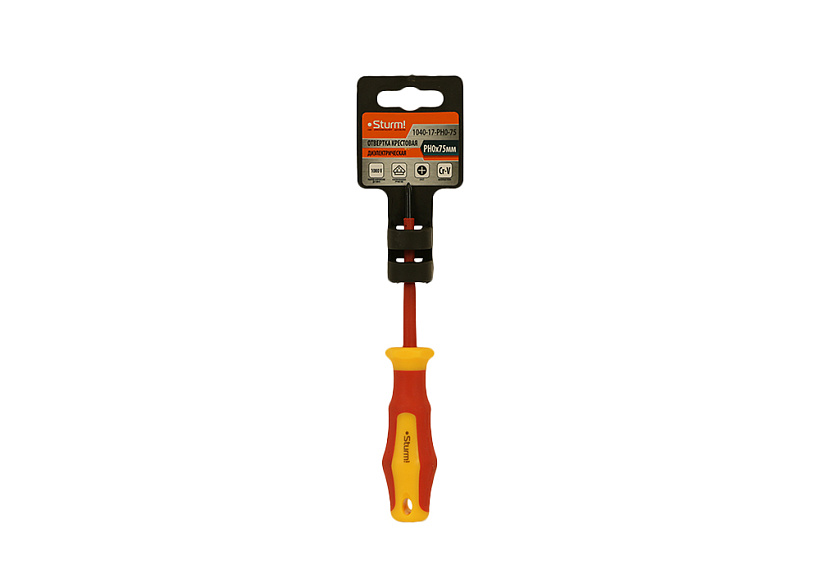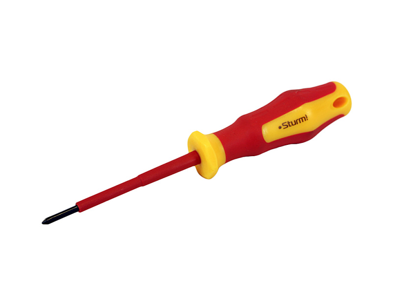 Отвертка Sturm! 1040-17-PH0-75 с многокомпонентной ручкой эргономичной ручкой. Отвертка для безопасной работы на оборудовании с максимально допустимым напряжением 1000 В. Многогранный край ручки для защиты от перекатывания отвёртки на рабочем месте.