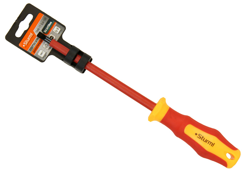 Отвертка Sturm! 1040-17-SL6-150 с многокомпонентной ручкой эргономичной ручкой. Отвертка для безопасной работы на оборудовании с максимально допустимым напряжением 1000 В. Многогранный край ручки для защиты от перекатывания отвёртки на рабочем месте.