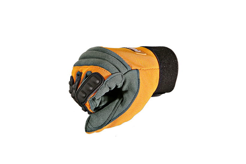 На пальцах с тыльной стороны нашиты специальные твердые накладки, которые дают высокую степень защиты в тяжелых условиях работы