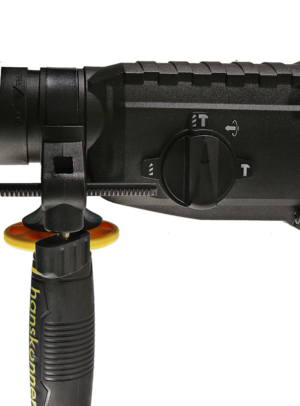 Hanskonner HRH0928LRE – универсальный трехрежимный перфоратор под тип патрона SDS Plus. Имеет классическую горизонтальную компоновку с продолговатым узким корпусом и небольшую массу, за счет чего максимально удобен при высотных работах, а также при эксплуатации в условиях с ограниченным доступом. Надежному и комфортному хвату способствует наличие эргономичных прорезиненных основной и дополнительной рукоятей SoftGripZone. Модель оснащена электродвигателем мощностью 1050 Вт и усиленным вакуумно-компрессионным механизмом, развивающим энергию удара – 3.5 Дж – это позволяет уверенно бурить отверстия диаметром до 28 мм в материалах различной твердости, включая кирпичную кладку, камень и бетон, а также использовать корончатые сверла больших диаметров (до 68 мм). Благодаря наличию ряда конструктивных решений Hanskonner HRH0928LRE отлично подготовлен для интенсивной эксплуатации: мотор имеет дополнительное бронирование арамидной нитью ArmorProtect, надежно защищающее от абразивного воздействия пыли, положительно влияют на ресурс фирменные подшипники высокого качества, а также наличие специального маслоотражательного кольца на червячном валу. Подпружиненный механизм поворота щеточного узла для реализации функции реверса, позволяет сохранять одинаковую мощность при любом направлении вращения, исключает случайные переключения во время работы и по статистике, снижает вероятность выхода из строя выключателя. Предусмотрена система автоматического отключения графитовых щеток AutoStop, предотвращающая повреждение коллектора при критическом уровне щеточного износа Универсальность применения гарантируют три режима работы – в зависимости от конкретной задачи пользователь выбирает нужный: сверление, сверление с ударом, либо режим удара. Помимо, трех рабочих режимов предусмотрен еще один дополнительный, дающий возможность установки долота в любом угловом положении. Также модель Hanskonner HRH0928LRE получила новый выключатель c функцией акселератора AccelSwitch, обеспечивающий плавное начало засверливания, а также оптимальный подбор скорости при работе с разными материалами. Для безопасности пользователя в перфораторе установлена предохранительная кулачковая муфта SafetyClutch – она позволяет избежать обратного удара в случае заклинивания оснастки. Сетевой кабель 4VelcroRubber имеет резиновую изоляцию, что сохраняет его гибкость и эластичность в условиях низких температур, а четырехметровая длина кабеля дает возможность использовать инструмент без применения дополнительного сетевого удлинителя, обеспечивая рабочую зону площадью до 50 квадратных метров. Шарнирное крепление кабеля обеспечивает его стойкость к изломам, способствуя долгому сроку службы. Инструмент штатно комплектуется вместительным пластиковым кейсом для удобства хранения и транспортировки.