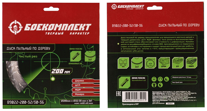 Пильный диск по дереву 200x32/30мм, 36 зубьев, БОЕКОМПЛЕКТ