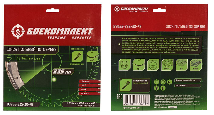 Пильный диск по дереву 235x30мм, 48 зубьев, БОЕКОМПЛЕКТ