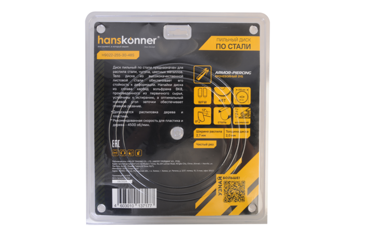 Пильный диск по СТАЛИ 255x30мм, 48 зубьев, Hanskonner