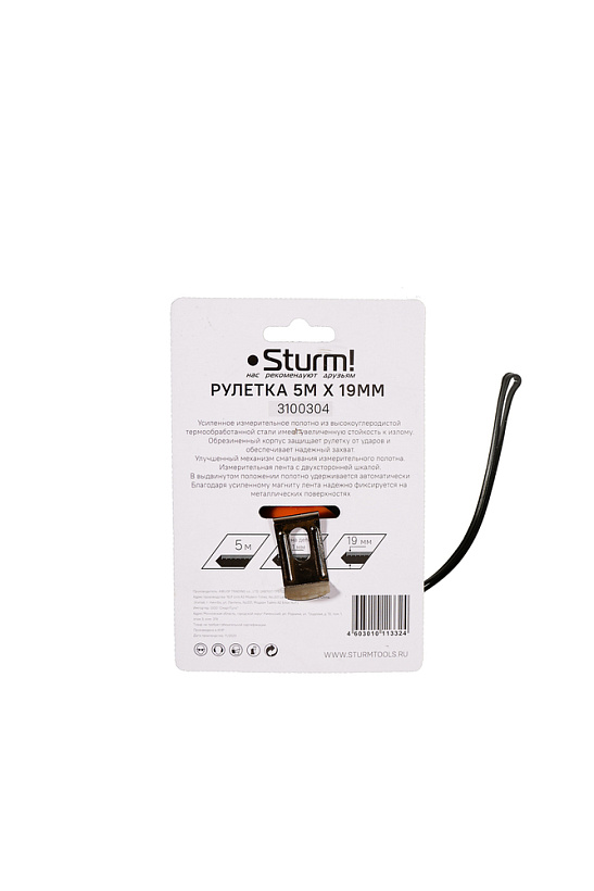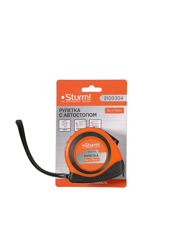 Рулетка 5x19мм, автостоп, двухсторонняя шкала, магнит на зацепе, Sturm!