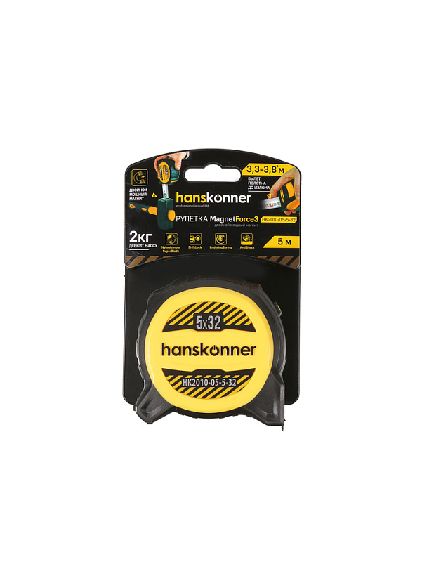 Рулетка Hanskonner HK2010-05-5-32. Рулетка MagnetForce3 5х32 оснащена двойным мощным магнитом для очень прочной фиксации полотна на металлической поверхности. Его можно также использовать для подбора магнитящихся предметов весом до 2кг.