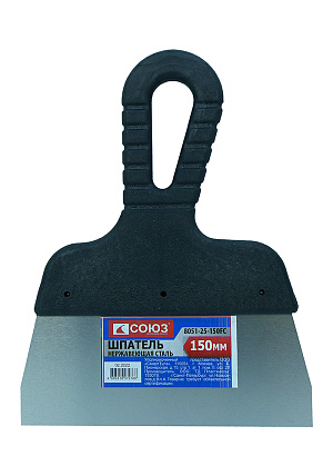 - 8051-25-150FC Шпатель, 150мм, нержавеющая сталь, пластиковая рукоятка, СОЮЗ Шпатели с пластиковой ручкой СОЮЗ обладает широким полотном, которое позволяет быстро и равномерно наносить, выравнивать, сглаживать шпаклевочный слой на обрабатываемой поверхности.