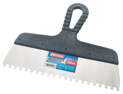 - Шпатель СОЮЗ 8051-45-250-10FC используется для нанесения и равномерного распределения различных густых, клеевых составов, создания фактурной штукатурки.