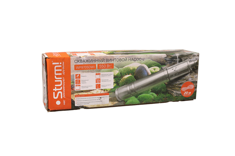 Sturm! WP9705DWI – погружной скважинный винтовой насос – предназначен для перекачивания чистой воды без песка или иных примесей из относительно неглубоких, узких скважин. Обладает небольшими габаритными размерами, благодаря чему удобен в транспортировке. Корпус устройства изготовлен из нержавеющей стали и стоек к воздействию агрессивной среды, и механическим повреждениям. Модель оснащена 550 Вт электродвигателем и рабочим элементом в виде винта-шнека – характеризуется высокой производительностью, и способна перекачивать за час до 1500 литров воды, обеспечивая ее подачу на высоту до 90 метров, осуществляя забор с глубины до 30 метров. Максимальная температура перекачиваемой воды не должна превышать 40 °C. Двигатель насоса имеет масляное охлаждение, что способствует его малому износу в процессе эксплуатации. Также, в конструкции Sturm! WP9705DWI предусмотрена термозащита – она отключает питание при перегреве и позволяет возобновить работу при остывании устройства до рабочей температуры. Наличие длинного 20-ти метрового кабеля питания дает возможность установить насос на необходимой глубине погружения.