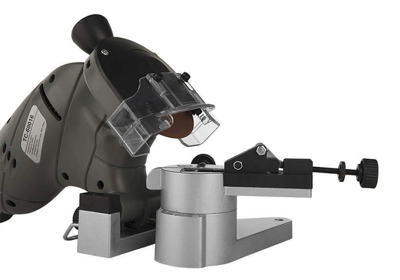 Прижимной механизм обеспечивает точность зажима зубьев цепи под требуемым углом к рабочей поверхности абразивного диска для получения правильной конфигурации режущих плоскостей. Применяемая двойная, винтовая и клиновая, фиксация обрабатываемого элемента, препятствует его смещению и выскальзыванию из рабочего ручейка.