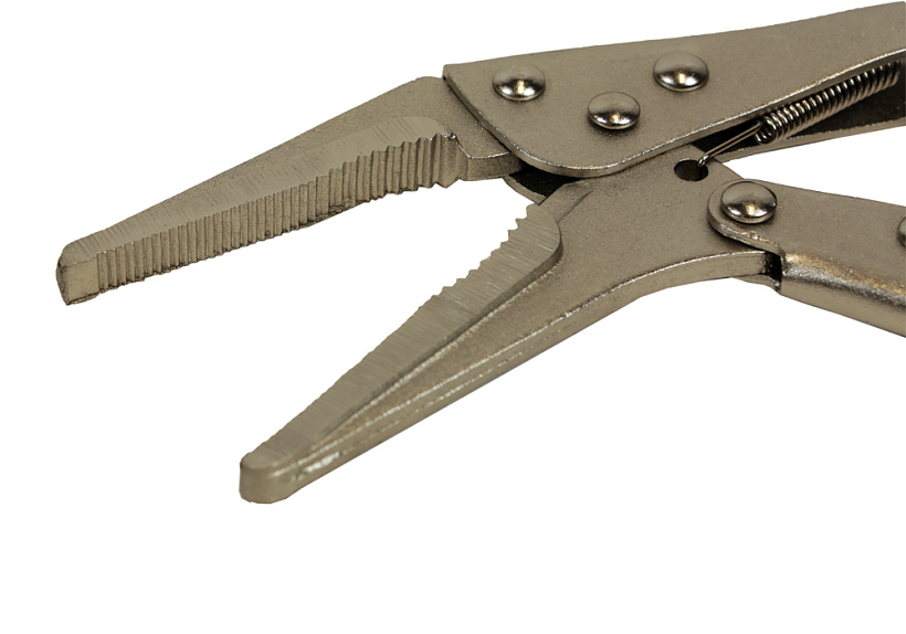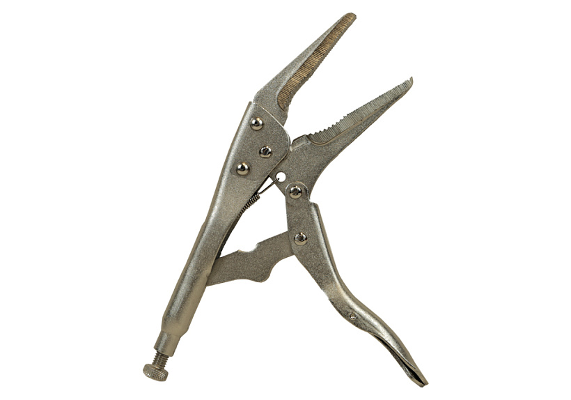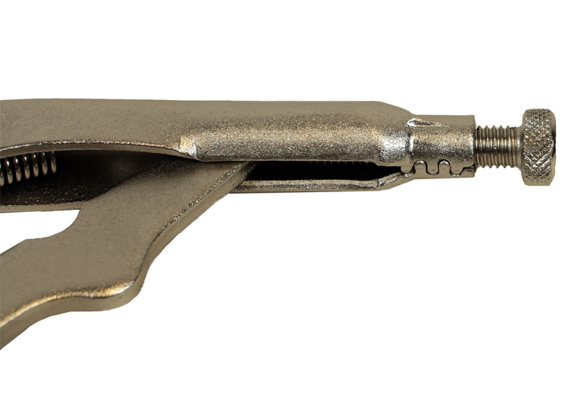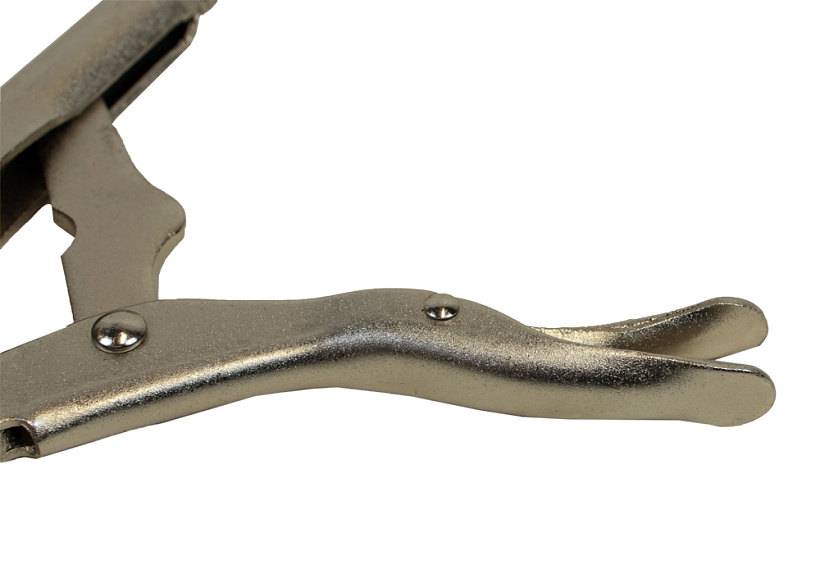Ручной зажим с фиксатором предназначен для для удержания и надежной фиксации деталей при проведении слесарно-монтажных и сварочных работ. Фиксация происходит при сжатии рукояток инструмента до упора благодаря особой конструкции блокирующего механизма.