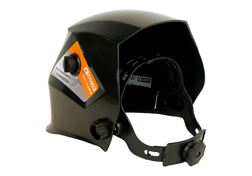 Сварочная маска СОЮЗ САС-91А5РФ. Простая в использовании модель для индивидуальной защиты как от вредного инфракрасного и ультрафиолетового излучения, так и от брызг расплавленного металла.