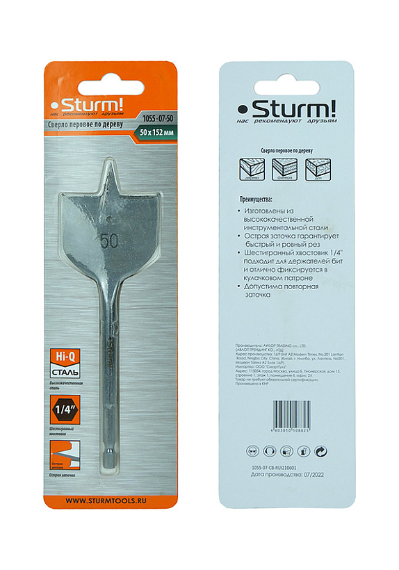 Сверло перовое по дереву, 50мм, шестигранный хвостовик, Sturm!