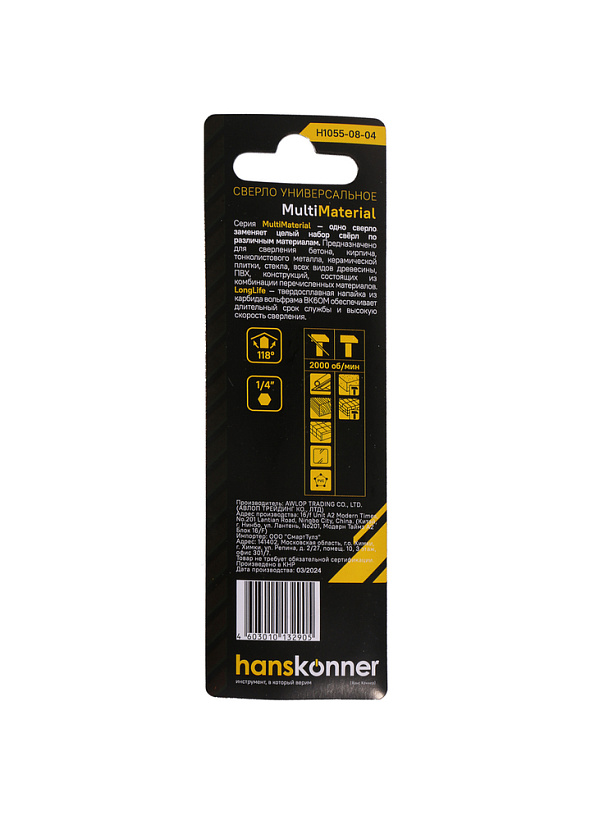 Сверло универсальное 4мм, Hanskonner H1055-08-04