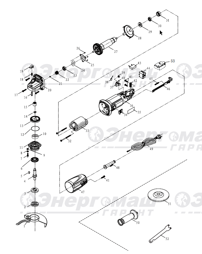 Гайки для крепления диска, комплект щеток, дополнительная рукоятка, ключ, защитный кожух в комплекте.