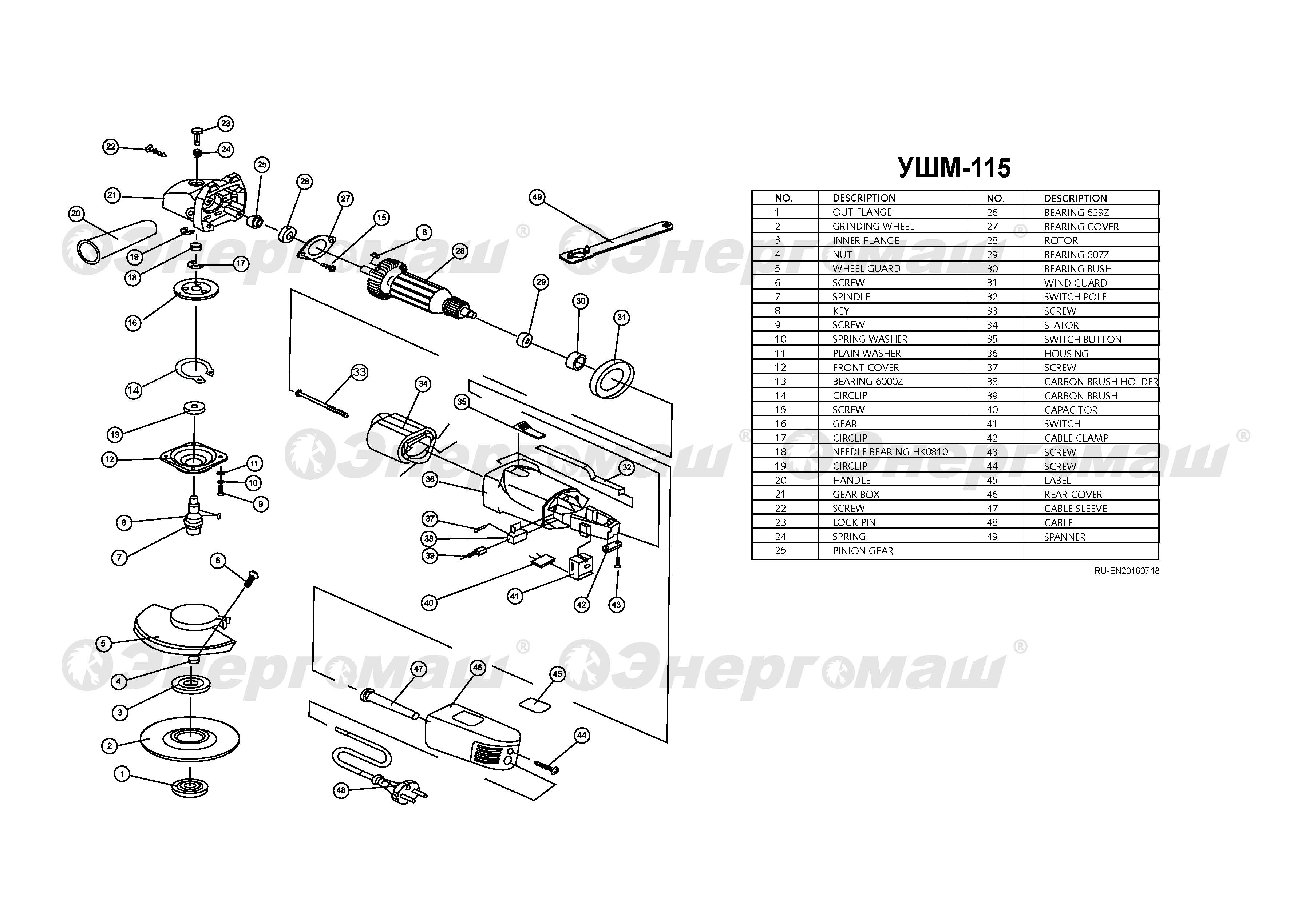 Гайки для крепления диска, комплект щеток, дополнительная рукоятка, ключ, защитный кожух в комплекте.