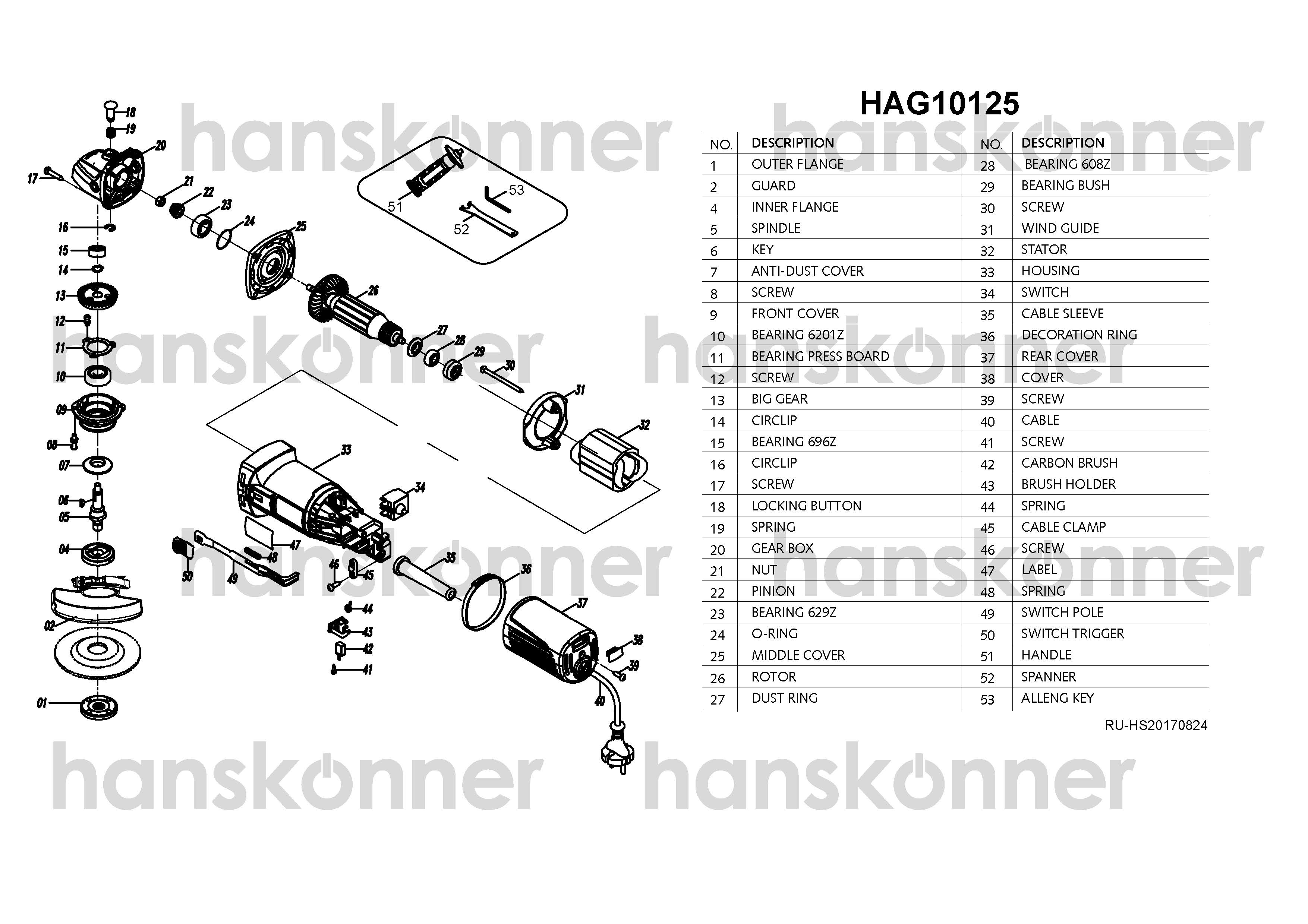 Ключ для установки диска, гайки для крепления диска, комплект щеток, защитный кожух в комплекте.