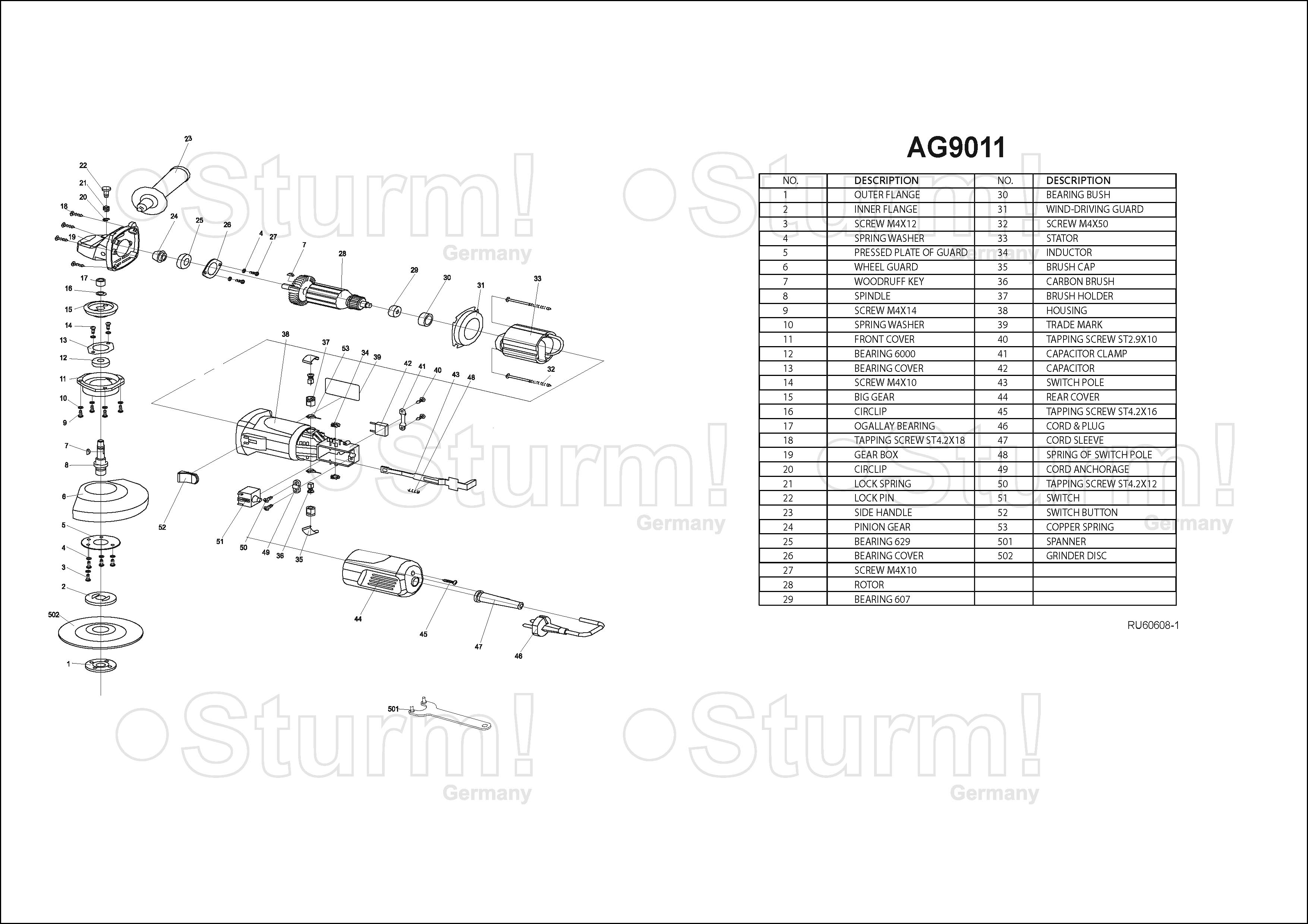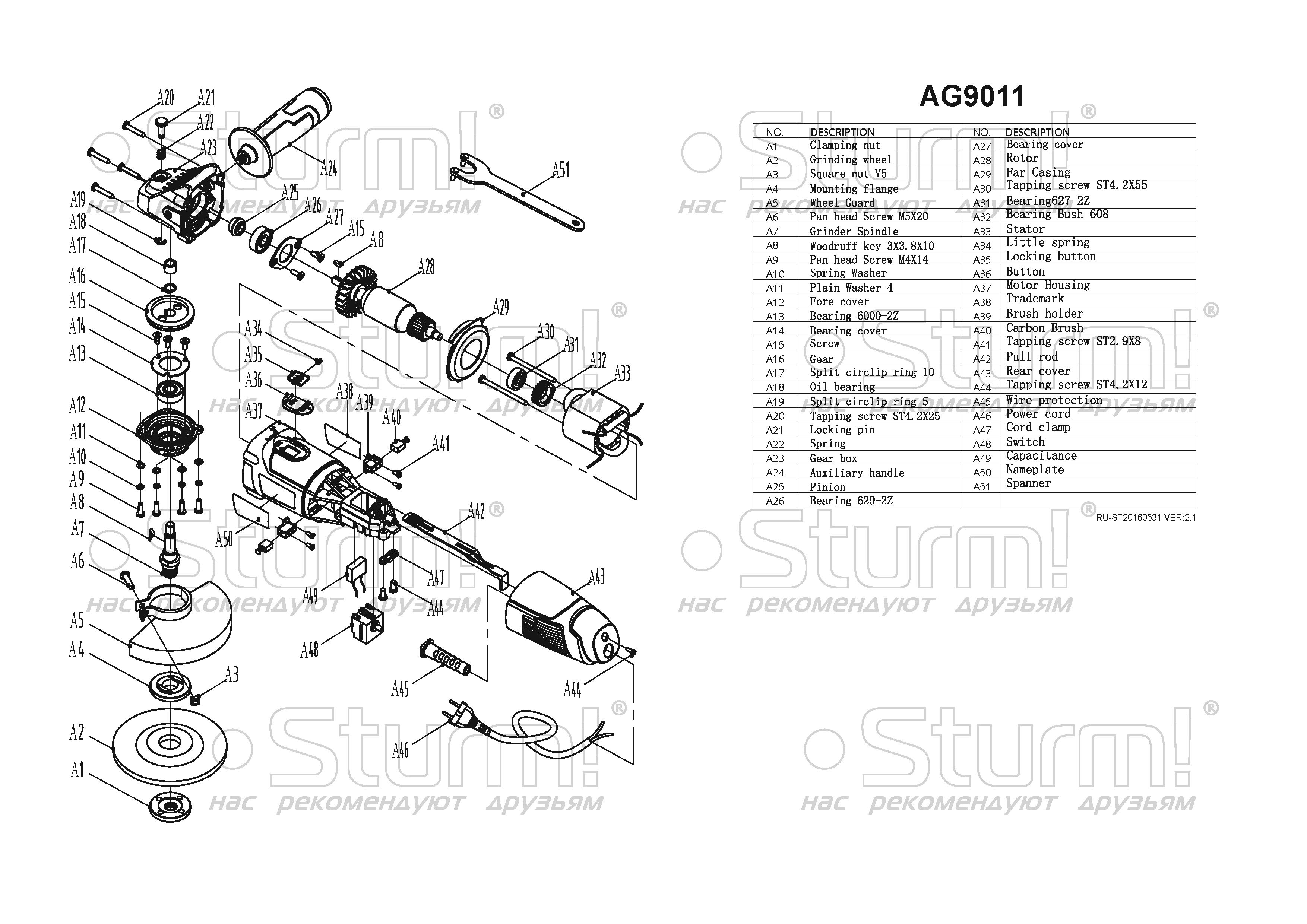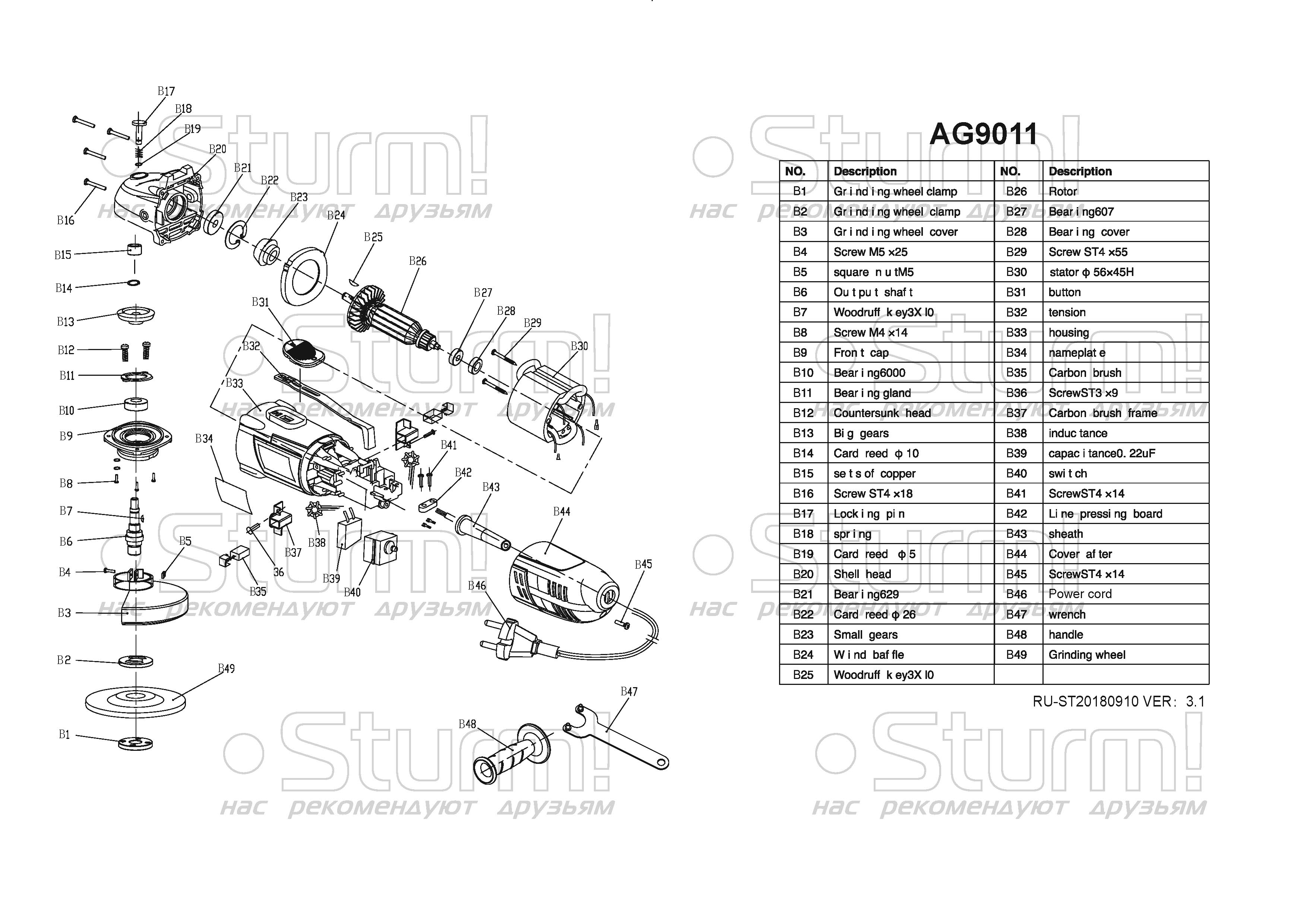 Гайки для крепления диска, щетки, дополнительная рукоятка, ключ, защитный кожух в комплекте.