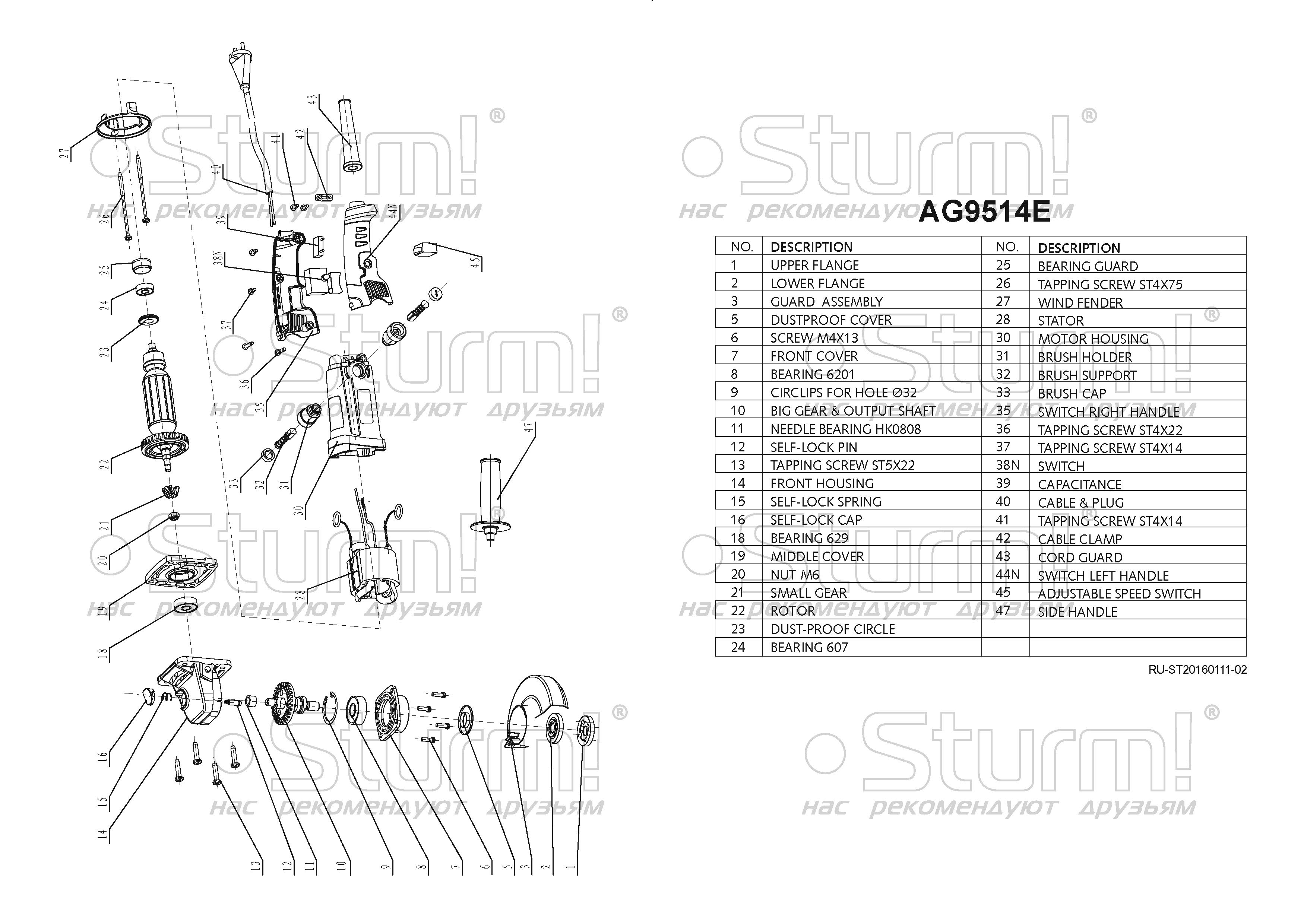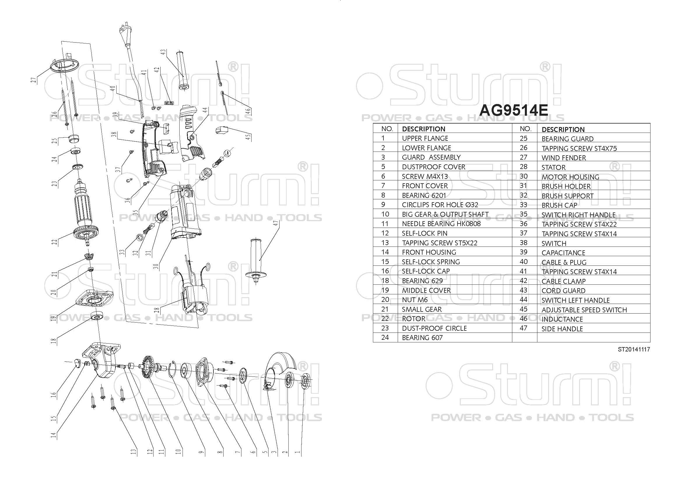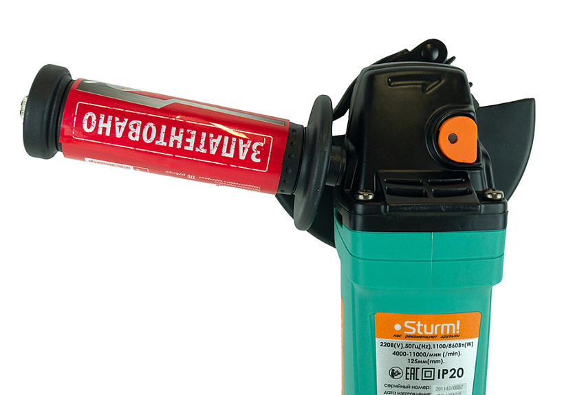 Sturm AG9514Е – универсальная болгарка (УШМ) бытового назначения под рабочий диаметр диска 125 мм. Имеет компоновку с длинной рукоятью и рассчитана под хват двумя руками. Основное преимущество данной компоновки – лучший контроль и удобство использования инструмента при зачистных и шлифовочных операциях. Работу в местах с трудным доступом призван облегчить низкопрофильный корпус редуктора клиновидной формы. Особенность модели – функция электронной регулировки оборотов (4000 – 11000 об / мин), благодаря которой достигается оптимальный подбор частоты вращения в зависимости от типа используемой оснастки и обрабатываемого материала. Для обеспечения высокого ресурса инструмента особое внимание уделено наиболее нагруженным элементам конструкции: электромотор покрыт несколькими изоляционными слоями термостойкого лака и имеет дополнительную защиту от пыли и абразивных частиц, благодаря закалке, повышенной прочностью обладают шестерни редуктора. Кроме того, применение шестерен с конической формой зуба позволило снизить уровень шума при работе. Инструмент прост в обслуживании и эксплуатации. Предусмотрена функция быстрого доступа к щеткам, позволяющая их замену без разбора элементов корпуса. Для удобства пользователя модель снабжена быстросъемным защитным кожухом, который надежно фиксируется при помощи специального зажимного рычага – это дает возможность при необходимости быстро изменять положение кожуха, не прибегая к помощи вспомогательного инструмента, а также удобной патентованной рукоятью со специальным твердосплавным карандашом для нанесения разметки на поверхности любой сложности, включая ржавые, влажные и маслянистые.