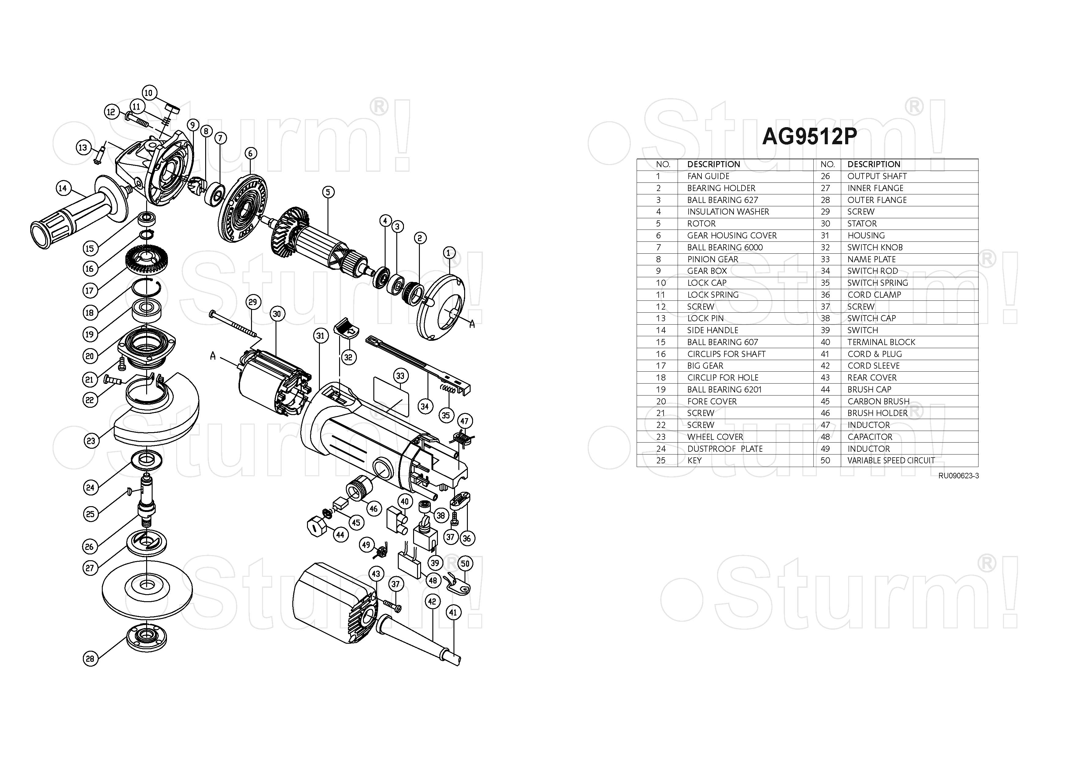 Об отличной приспособленности к зачистным и шлифовочным работам свидетельствует отдельные конструктивные решения: вал шпинделя установлен на двух шарикоподшипниках, забор воздуха в двигатель производится с торцевой части корпуса (со стороны сетевого кабеля), за счет чего значительно снижается возможность попадания в двигатель пыли и абразивных частиц, корпус редуктора вместо привычных двух имеет три гнезда под крепление дополнительной рукояти. Однако, ключевая особенность, обеспечивающая универсальность применения – наличие константной электроники, которая позволяет поддерживать одну и ту же частоту вращения на валу шпинделя, как на холостом ходу, так и под нагрузкой, препятствуя просадке по оборотам. Важной особенностью Sturm AG9512P является система плавного пуска – она снижает пусковые нагрузки на двигатель и предотвращает рывок инструмента в момент включения. Модель проста в эксплуатации и обслуживании. Снабжена быстросъемным защитным кожухом, надежно фиксирующимся при помощи специального зажимного рычага, не прибегая к вспомогательному инструменту, а также удобной обрезиненной патентованной рукоятью с твердосплавным разметочным карандашом внутри. Предусмотрена возможность быстрого доступа к щеткам, что существенно упрощает процесс их замены, так как исключает демонтаж элементов корпуса.