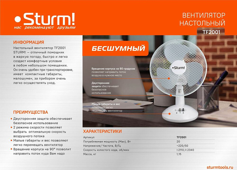 Современный настольный вентилятор Sturm! станет незаменимым помощником в душном офисе и в любом малогабаритном пространстве. Прибор отличается компактностью и легкостью. Его можно поставить даже на небольшую поверхность - стол, подоконник, полку.